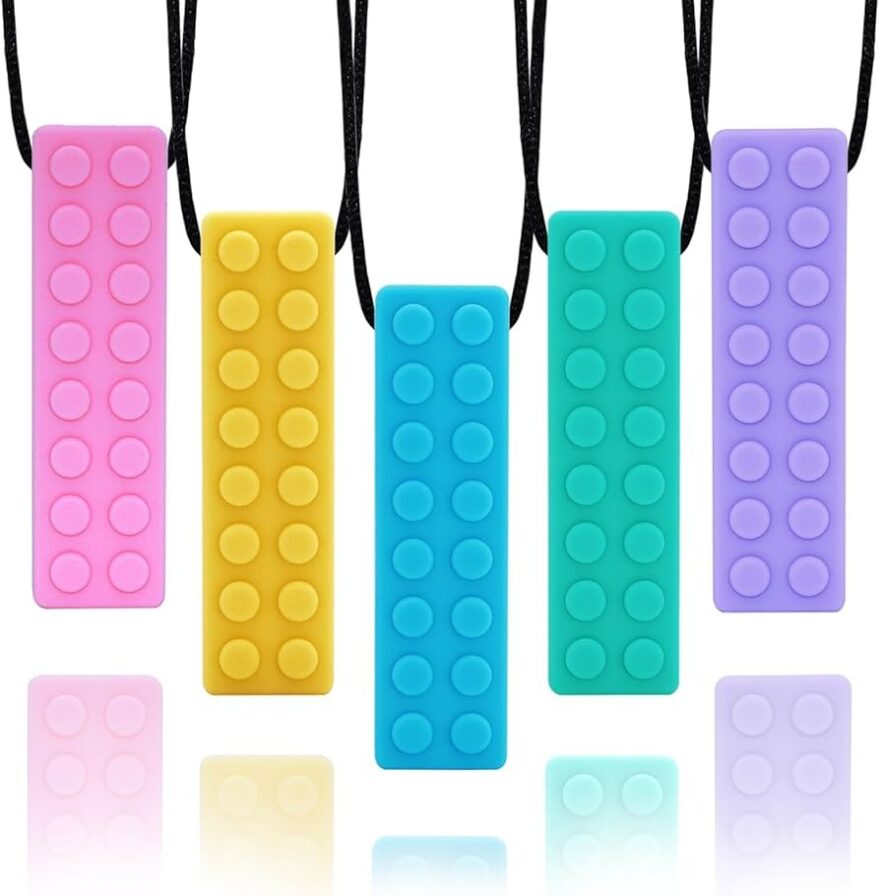A LEGO-style chewable necklace is exactly what it sounds like: a pendant shaped like a classic building block, made from food-grade silicone, attached to a breakaway cord for safety.