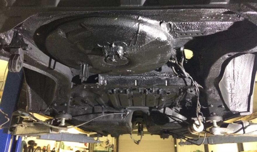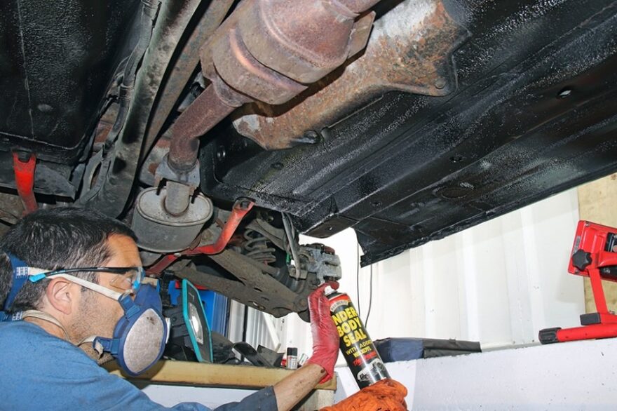 A proper job includes detailed inspection, pressure washing and degreasing, drying, rust removal, rust conversion or priming, masking sensitive parts, applying a protective coating, and often injecting cavity wax into sills, chassis rails, and crossmembers.